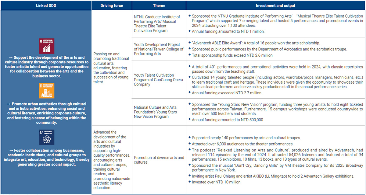 Since 2015, Advantech has continuously supported the National Taiwan College of Performing Arts by sponsoring the Department of Acrobatics' graduation performances and the Peking Opera troupe and acrobatics troupe to advance their skills. The purpose is to expand performance opportunities for students engaged in traditional arts and culture and to enhance the visibility of traditional opera. To encourage students with exceptional talents to persist in their artistic pursuits, the Company sponsored the Department of Acrobatics in establishing the "Advantech Elite Award" scholarship to recognize outstanding students. -