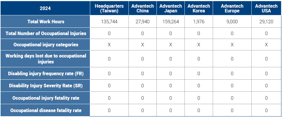 Advantech is committed to providing a safe and healthy workplace. We have established and implemented an ISO 45001–compliant Occupational Health and Safety Management System (OHSMS) and, in 2024, required every plant to adopt systematic management in accordance with ISO 45001. Our Occupational Health and Safety Management Policy was approved by the Board of Directors, implemented company-wide, and publicly disclosed on our website.