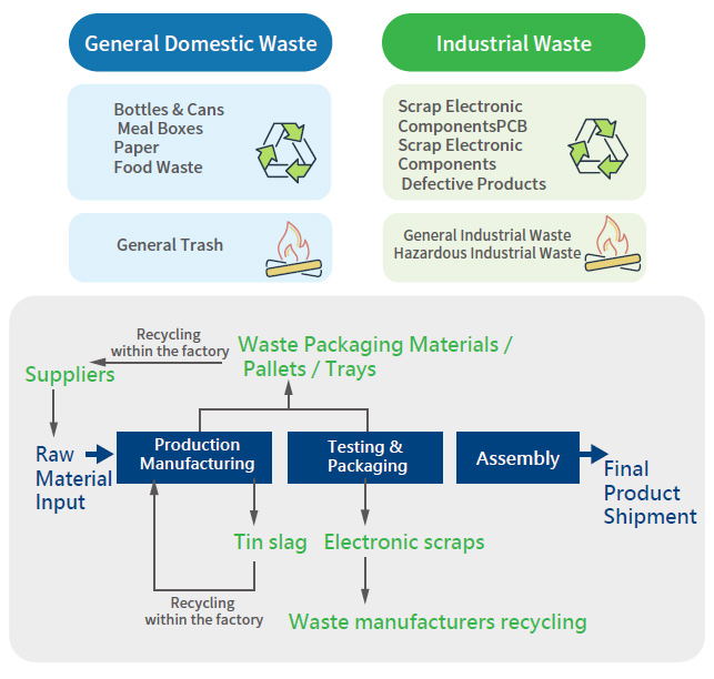 In terms of waste recycling and reduction, Advantech not only works with end-of-life recyclers to convert waste into recycled raw materials but also collaborates with upstream suppliers. This includes initiatives such as recycling and reusing packaging materials, reusing wooden pallets, and modifying PCB designs to reduce edge scraps. Waste generation is minimized in the plants by reusing solder dross. Through collaboration among the plant, suppliers, and waste disposal contractors, Advantech aims to minimize waste incineration, reduce environmental impact, and achieve sustainable resource circulation. In addition, Advantech's Kunshan plant in China launched a research project in 2023 to transition from liquid painting to powder coating. The project was fully implemented in 2024, resulting in a reduction of approximately 30 tons of lacquer residue waste. The Company's waste management model is shown in Figure.