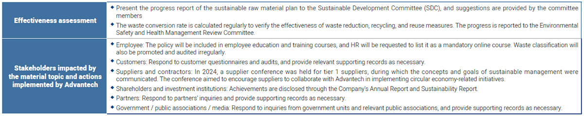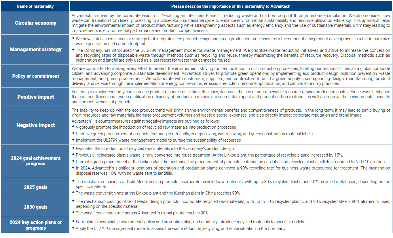 Advantech is dedicated to implementing the zero waste to landfill policy and the plant business waste reduction, recycling, and reuse program. As of 2024, Advantech has implemented the UL2799 zero waste to landfill standard management, beginning with our ACL facility. Currently, Advantech no longer uses landfills to dispose of the waste. Furthermore, we are optimizing our waste management, re-evaluating waste categories and flows, and exploring more opportunities for waste recycling to reduce the possibility of waste going directly to incineration plants, in turn improving the waste conversion rate. In 2024, the self-assessed waste conversion rate for Advantech's significant locations of operation and production plants worldwide was 74% (the calculations for ANA, AEU, AJP, and AKR only included the amount of business waste, and certain internally recycled resources were not included). Meanwhile, Advantech also adheres to the ISO 14001 management system standards to ensure that waste disposal contractors and their disposal methods comply with local regulations. To accurately understand the waste disposal situation, Advantech regularly conducts audits of waste disposal contractors according to the law to ensure that all outgoing waste is disposed of legally. During the waste disposal contractor selection process, factors such as whether they have obtained/passed relevant qualifications are included in the evaluation. After waste is transported off-site, the Company verifies its legal disposal through government reporting platforms or by reviewing disposal certificates provided by contractors. If necessary, Advantech also conducts on-site inspections of waste treatment facilities to ensure that waste handling processes and contractor service quality comply with Advantech’s standards and regulatory requirements. In 2024, there were no major breaches of contract or legal violations by any of Advantech’s waste contractors.