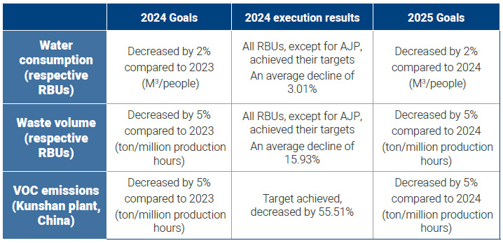 Since 2022, aside from its Taiwan headquarters and Kunshan plant in China, Advantech has expanded the collection of environmental data to include facilities in AJP, AKR, ANA, and AEU. In 2023, the Company set environmental management targets for each RBU or production plant. Their achievement status in 2024 and targets for 2025 are outlined in the following table.
