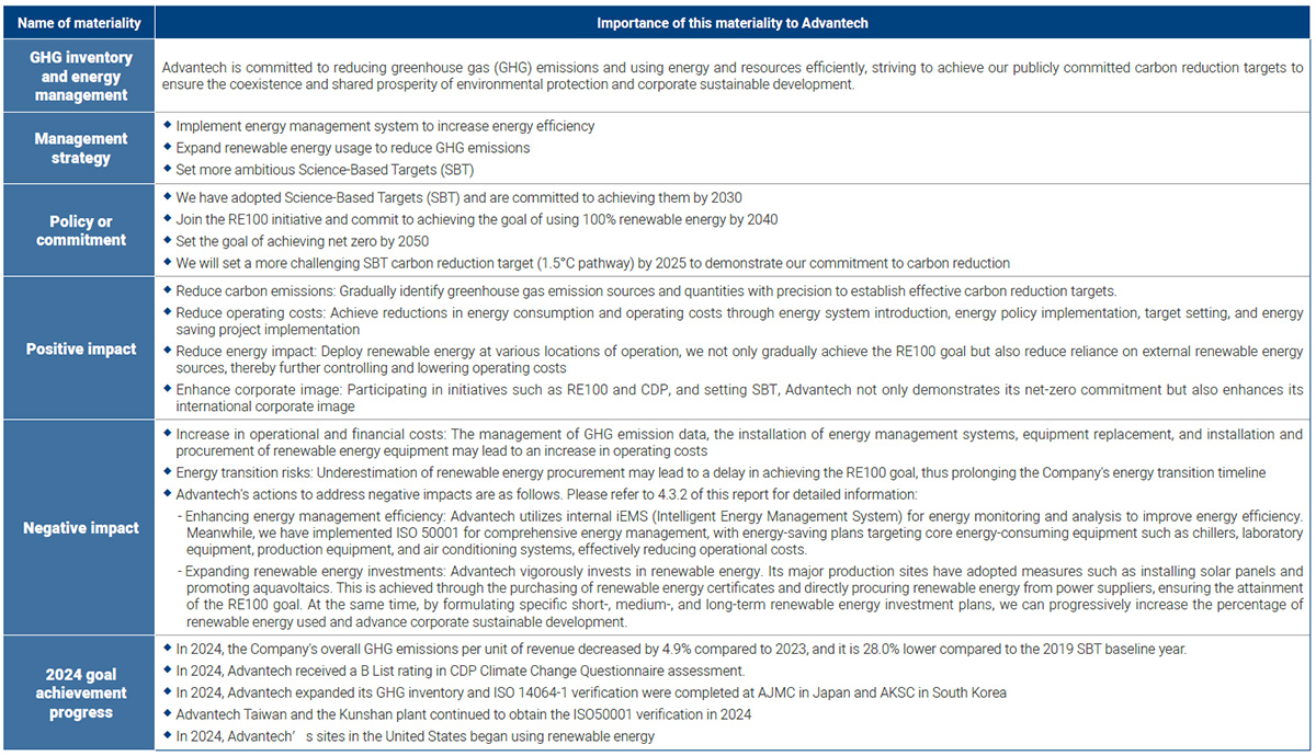 In order to create a low-carbon emission business environment, Advantech has established the “Greenhouse Gas Inventory Promotion Committee” based on the quantification, monitoring, reporting, and verification procedures for GHG inventory provided by Taiwan's Climate Change Response Act and the ISO 14064-1 standards to promote GHG inventory and reduction work in order to reduce direct and indirect GHG emissions year by year. And joined the Carbon Disclosure Project (CDP) since 2015 to disclose the Company's carbon reduction plans and performance annually.