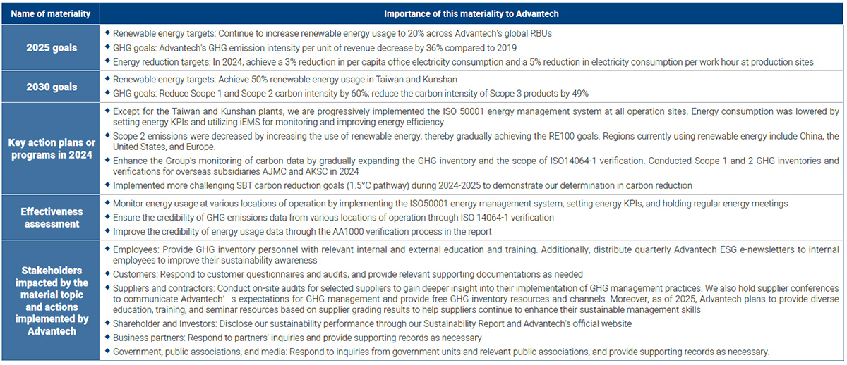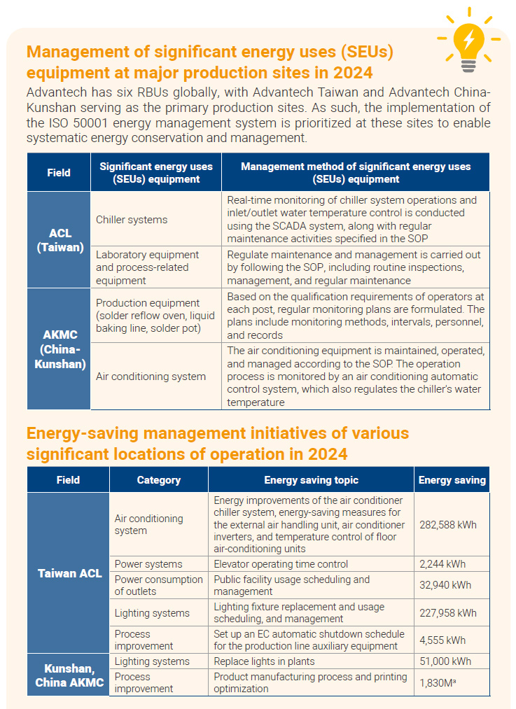 Electricity is Advantech's main energy source. To minimize the environmental impact of its products and production activities, Advantech has established an Energy Management Policy and implemented the ISO 50001 energy management system at its significant locations of operation in Taiwan and Kunshan, China, to systematically manage energy reviews, energy-saving solutions, and benefit analysis processes. Meanwhile, Advantech has established an intelligent energy management system (iEMS) that can monitor energy consumption in real-time, identify energy hotspots, and optimize equipment operation to improve electricity usage efficiency. Additionally, Advantech has established clear energy-saving indicators and targets, and the energy management unit regularly convenes project meetings to monitor implementation progress to continuously increase energy usage efficiency and the percentage of renewable energy used. Furthermore, in 2024, Advantech also monitored electricity consumption management indicators across its six global RBUs to further standardize and improve electricity management in its various operations. At the same time, we continue to launch global renewable energy initiatives, enhance the procurement and usage of renewable energy, and collaborate with all locations of operation to achieve RE100 goals and sustainable energy management.