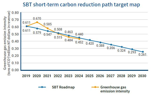 In 2024, the average GHG emissions (Scope 1 and Scope 2) per unit of revenue for Advantech's main global operations and production sites were 0.440 metric tons of CO₂e per NTD million, representing a decrease of 28.0% and 4.9% compared to the average GHG emissions per unit of revenue in 2019 and 2023, respectively. This demonstrates our continued progress towards the 2030 SBT of a 60% reduction, as shown in Figure.