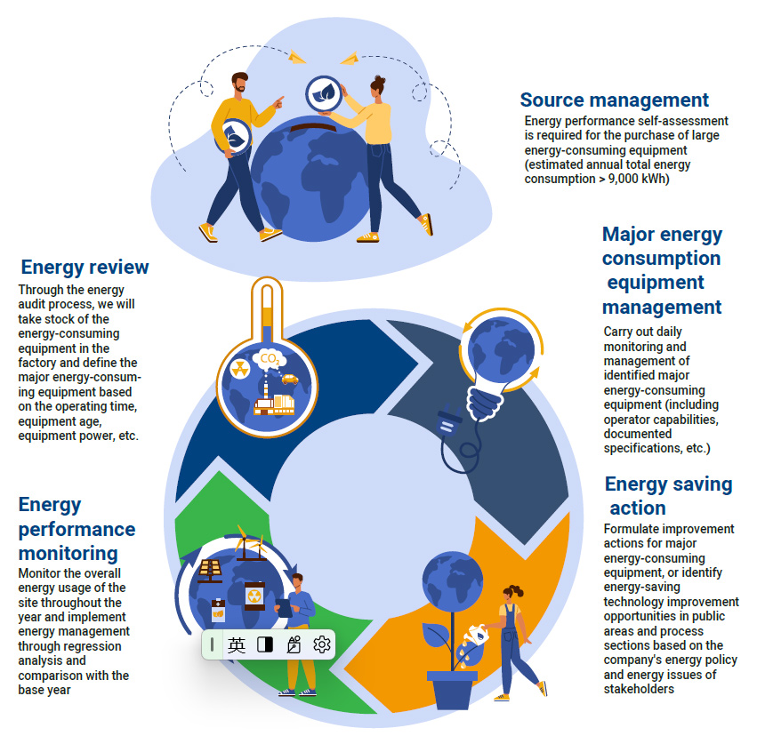 Advantech has established an internal energy management mechanism and introduced the ISO 50001 Energy management systems. Through the effective operation of the management system, Advantech implements source management from the procurement side, evaluates the organization's energy consumption through energy review, and identifies energy consumption hot spots. This is combined with the self-developed iEMS. We implement real-time monitoring using the system’s energy dashboard to manage major energy-consuming equipment to ensure optimal energy efficiency. We also formulate energy-saving solution benefit analysis processes in a series for continuous improvement, constantly optimize energy management processes and measures, and continuously improve energy efficiency.