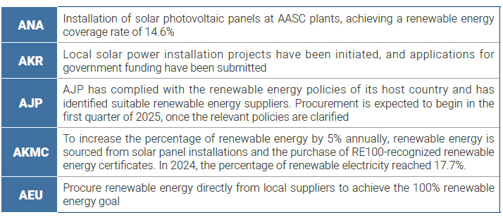 *Note 2: In 2024, the regions using renewable energy included AKMC, AEU, and ANA. AKMC utilized Green Energy Certificates (GEC); AEU sourced 100% renewable energy directly from supplier; and ANA partially used electricity generated by its solar power system.