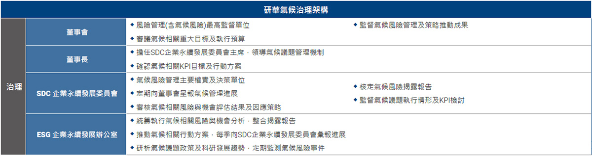 氣候變遷造成的極端氣候事件、各國積極的減碳目標所帶來低碳轉型壓力,以及來自價值鏈上下游的減碳要求,導致企業已面臨潛在的營運衝擊。因應全球逐步強化辨識氣候風險與財務影響連結性之需求,研華導入「氣候相關財務揭露架構」(Task Force on Climate-related Financial Disclosures,簡稱 TCFD),依照 TCFD 指引建議之氣候治理、策略、風險管理和關鍵指標四大核心元素推動氣候變遷管理與揭露,以系統化作法衡量公司面臨之氣候風險與機會,深入評估既有風險管理程序於泛營運風險地圖中關注的氣候變遷風險,評估結果及因應計畫彙報予 SDC 企業永續發展委員會,並由 SDC 企業永續發展委員會定期向董事會報告氣候管理進展,藉以提升企業因應氣候風險之韌性,詳細氣候風險與機會揭露及管理行動請參考「2024 研華氣候與自然相關財務揭露報告書」。