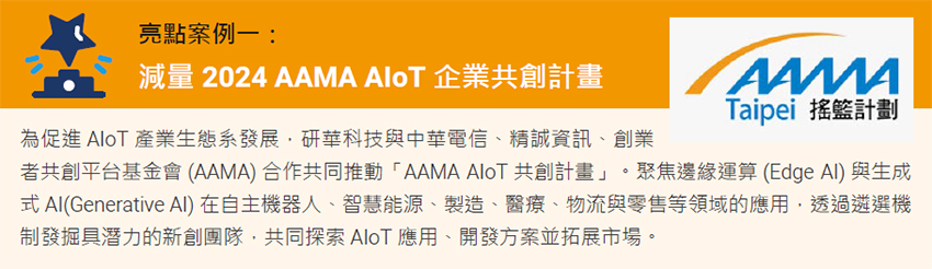 | AAMA 創業者共創平台基金會 | 智慧製造、智慧醫療、智慧環保、智慧物流 | 與中華電信合作,以產業命題與輔導方式招募共11家新創公司,並實際與5家公司進行共創方案的探討。 | |