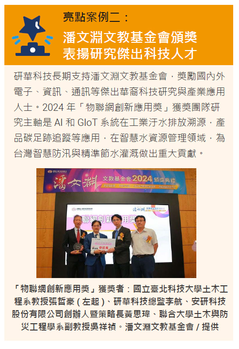 | 潘文淵物聯網創新應用獎 | 工業物聯網 | 共招募8隊物聯網應用之新創/學校團隊,並實際遴選出物聯網農業應用之創新團隊,以獎金、產業業師實際輔導該技術產業化應用。 | |