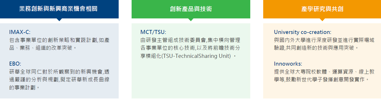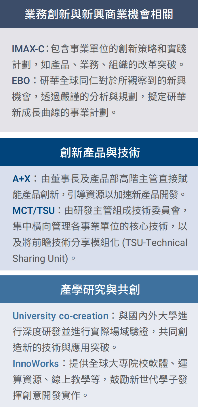 研華目前的幾個重要的創新機制,包括產品、技術、事業、學界合作等,皆由董事長及高階主管親自帶領,並務實的長期推動,約包括三大類、五個項目: