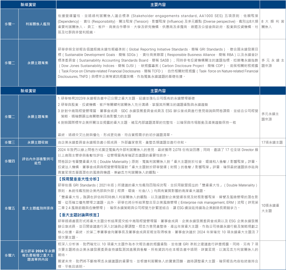 ESG 企業永續辦公室依據企業營運情形,並參考年度國際永續趨勢、企業自身營運發展、相關同行永續發展進程,奠基於往年的永續報告書報導基礎,及向企業永續辦公室最高主管書面會報。根據國際標準AA1000 SES 利害關係人議合標準(AA1000 Stakeholder Engagement Standard),利害關係人群體與往年維持一致,包括:員工、客戶、商業合作夥伴、大學及研究機構、供應商及承攬商、媒體及公協會與政府、股東與投資機構、社群及社區及非營利組織,共八大類利害關係人。