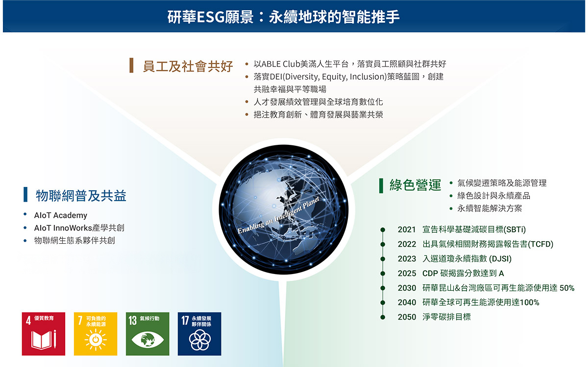 研華ESG願景是由企業本身願景「智能地球的推手」出發,考量企業核心競爭力、重點發展策略,並響應聯合國永續發展目標,我們立志以AI+IoT核心技術與智能解決方案,協助實現SDG 7, 13中的能源效率改善、建築與製造節能、物流/零售低碳等目標;透過研華的開放創新環境、物聯網平台與解決方案的教育普及,我們回應SDG4優質教育與17夥伴關係促進的目標。